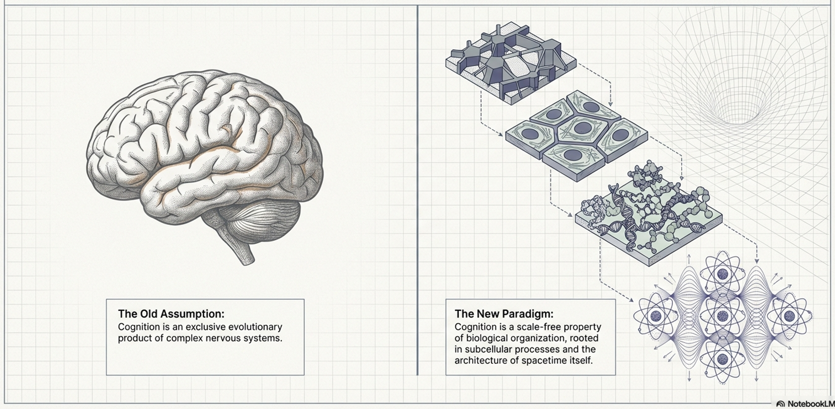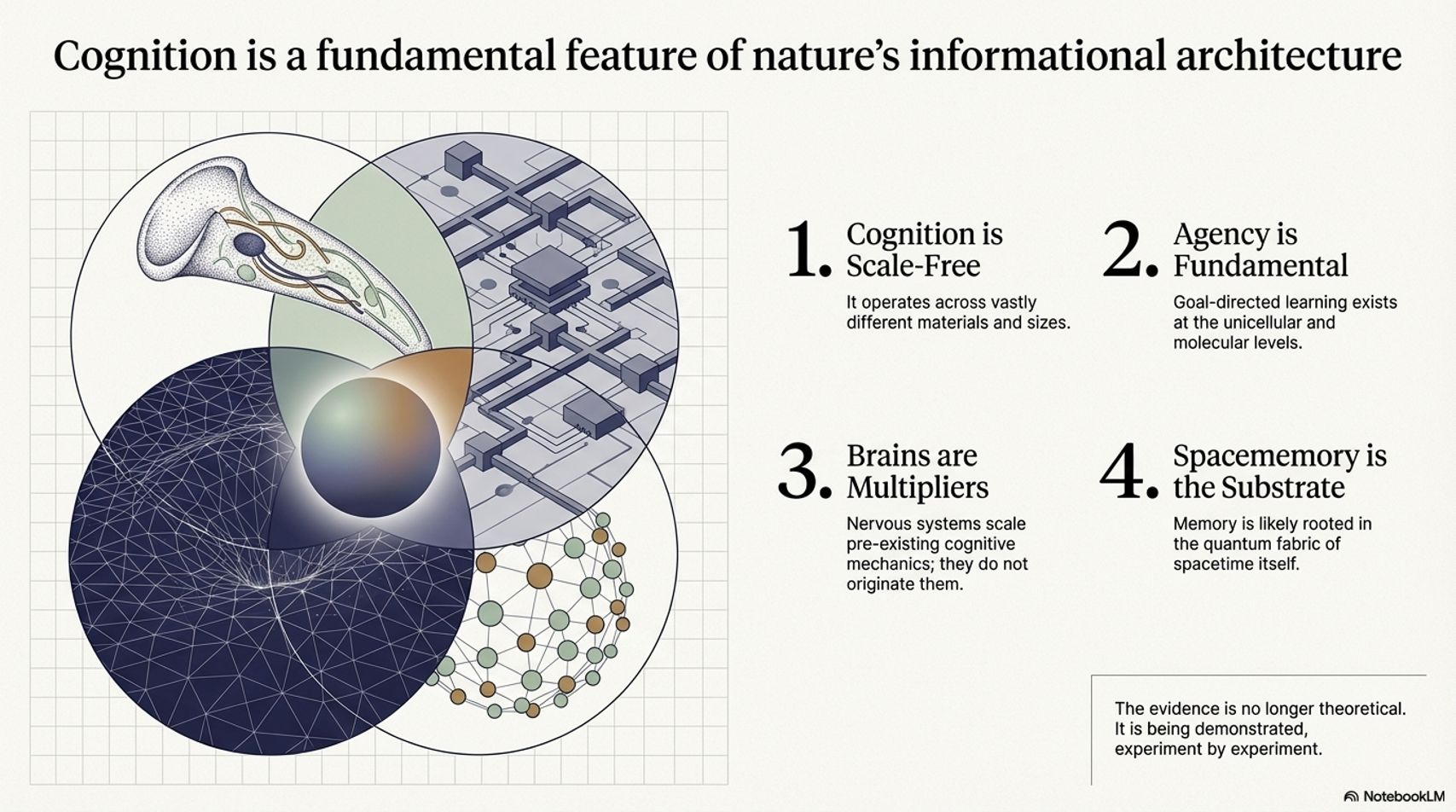 The uncomfortable question this raises for neuroscience is significant: if Pavlovian conditioning can occur in a single cell, and if emergent memory can arise in a glob of jelly, then what exactly are brains for? The answer, we suggest, is not that brains invent cognition from scratch, but that they scale, refine, and integrate cognitive capacities that already exist at more fundamental levels of organization. Synaptic networks did not create memory — they built upon memory mechanisms that were already operative in the molecular and subcellular architecture of their constituent cells and perhaps even from the quantum memory matrix dynamics of spacetime itself.