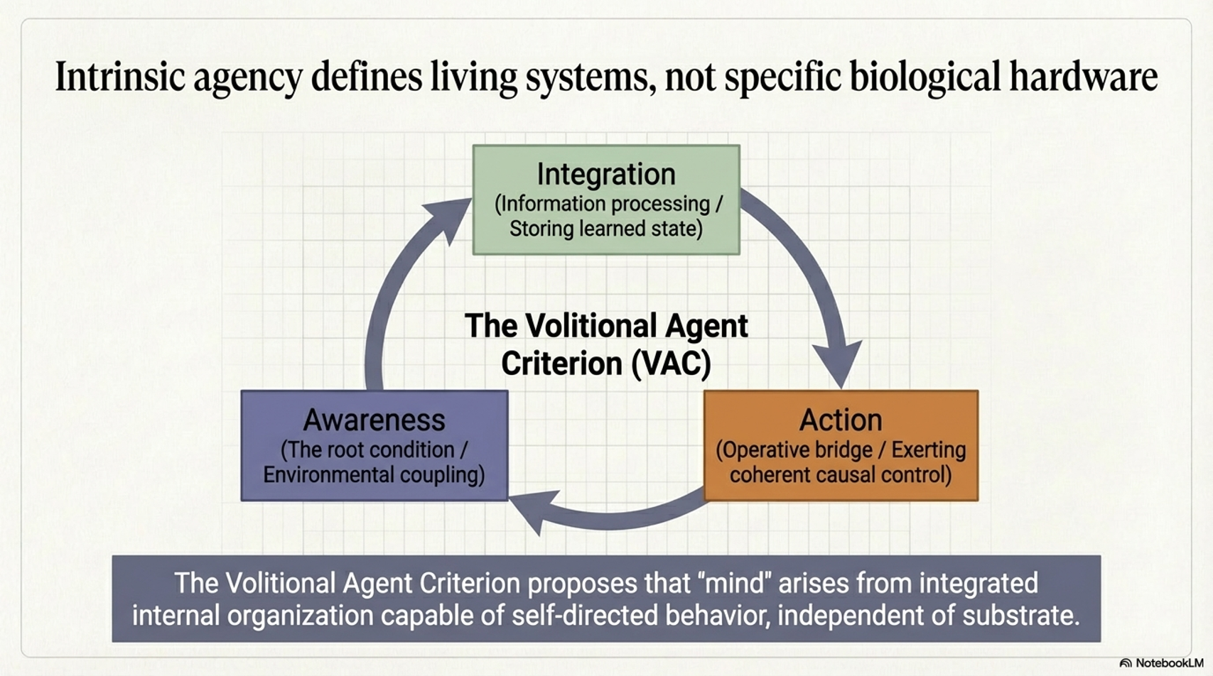 This convergence of evidence is precisely what the Volitional Agent Criterion framework was developed to address. The VAC proposes that what distinguishes living from non-living systems — and what gives rise to “mind” in its most fundamental sense — is not any specific biological structure but the emergence of intrinsic agency: coherent, self-directed behavior arising from integrated internal organization that is substrate-independent.