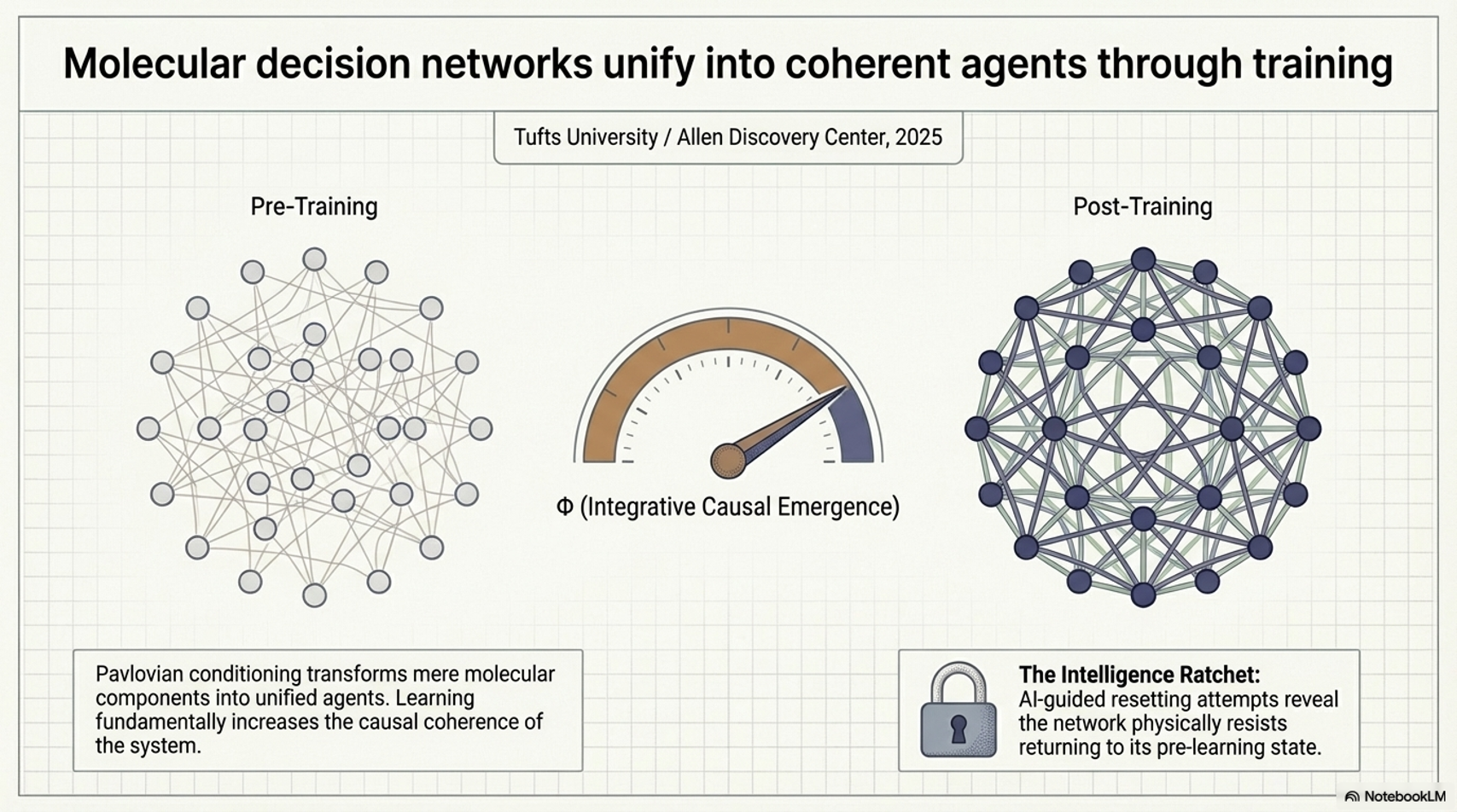 This finding dovetails powerfully with computational work from Michael Levin’s group at the Allen Discovery Center at Tufts University. As I discussed in a recent analysis, Levin’s team (Pigozzi, Goldstein & Levin, 2025) modeled 29 biological gene regulatory networks (GRNs) and subjected them to a Pavlovian-style associative conditioning protocol — essentially “training” these molecular-level decision networks to respond to paired stimuli. The results, published in Communications Biology, were remarkable: successfully conditioned networks showed increased integrative causal emergence (measured as higher Φ), meaning they became more unified and coherent in their causal structure after learning.