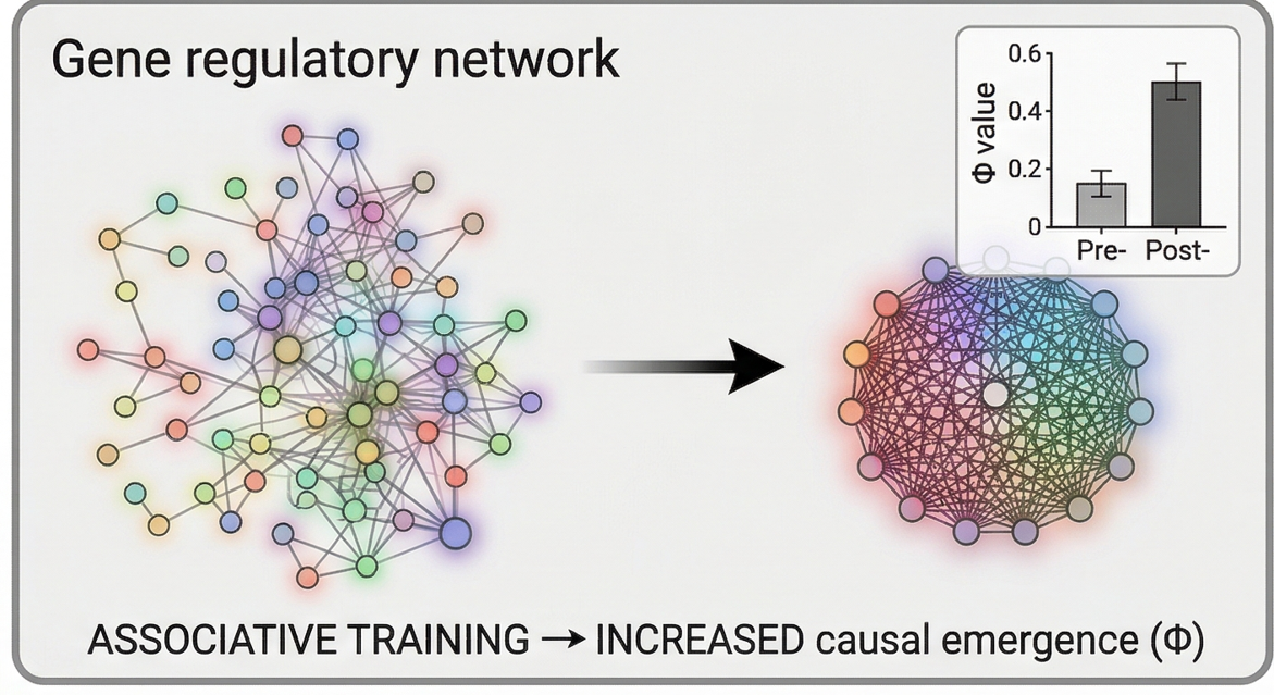 • Gene regulatory networks (computational models of real molecular circuits) show increased integrative causal emergence — becoming more agent-like — after associative training.