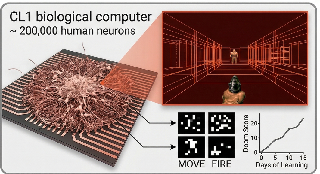 Against this backdrop, recent achievements in biocomputing take on deeper significance than the headlines suggest. In early March 2026, Australian biotech company Cortical Labs demonstrated that their CL1 biological computer — approximately 200,000 human neurons derived from induced pluripotent stem cells, grown on a high-density microelectrode array — had learned to play the classic first-person shooter Doom.