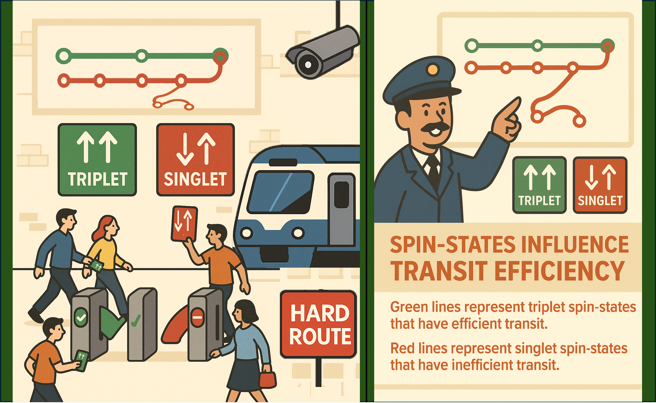 A rough analogy is to imagine a busy train station where every traveler carries either a red or green ticket. The layout of the station (like Marcus theory’s energy landscape) determines which routes are easy or hard to take, but the ticket color (the spin state) decides which doors will actually open for each traveler. A small change in lighting or signage—like a weak magnetic field or a pulse of blue light—can subtly shift who goes where, and at the end of the day, security cameras (like NMR in photo-CIDNP experiments) can look back at the crowd patterns and see a clear imprint of which ticket colors dominated which routes. In the same way, spin states inside cells can quietly gate which chemical pathways are favored, leaving a detectable “pattern” in the reaction products and, ultimately, in how the cells move and heal.