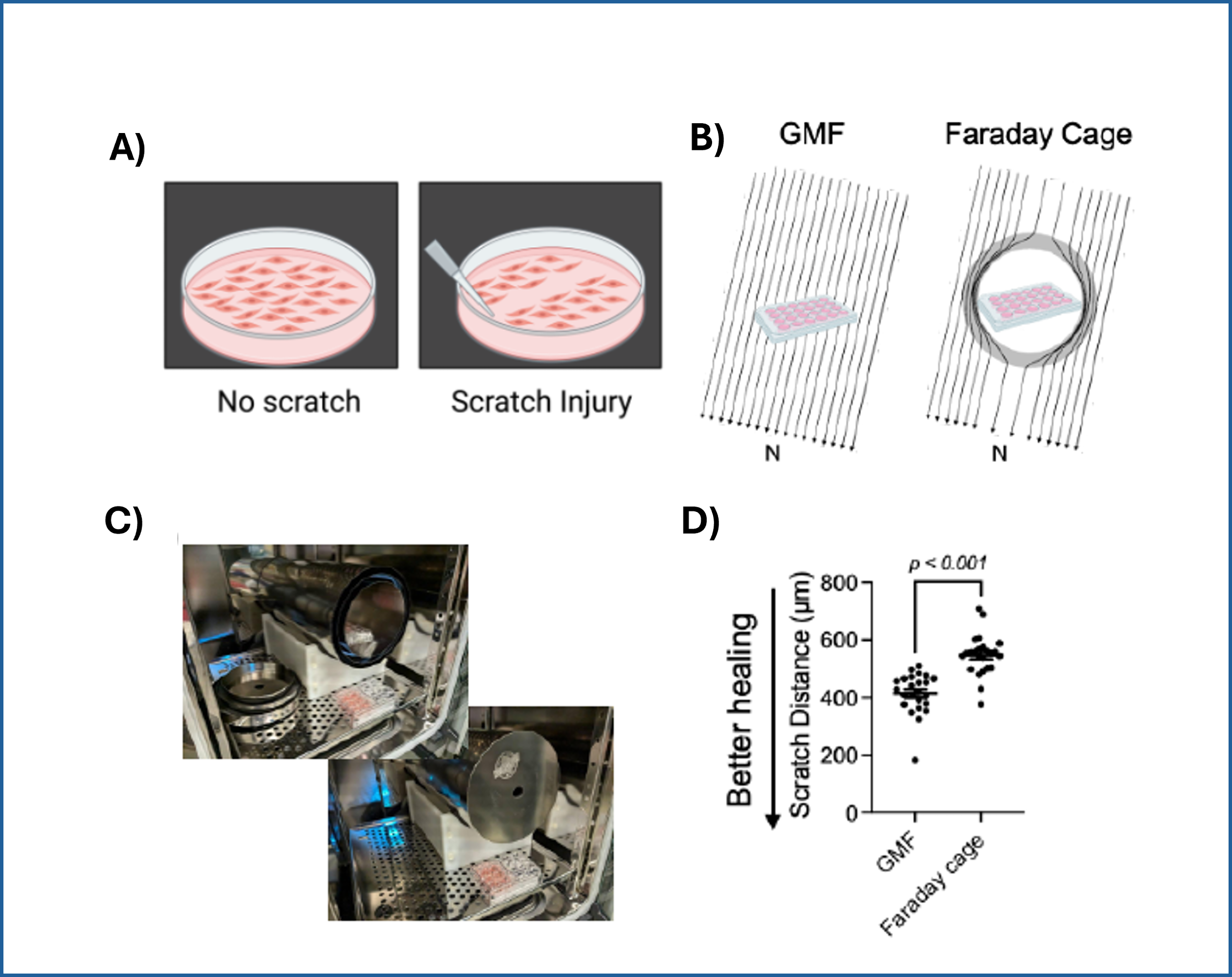 Figure 3: A) A standard scratch-wound healing assay used to test cell migration. The "wound" is created by physically scraping a line through a confluent cell layer, and the closure of that wound is tracked over time. This allows researchers to quantify how efficiently cells can migrate and "heal" the gap. B) Cell cultures with scratch (in 24-well plates), placed either inside a standard incubator (GMF present) or inside a Mu-metal Faraday cage (GMF blocked). C) Photograph of the scratched cells in the Mu-metal Faraday cage placed inside a cell culture incubator. D) Statistical results for scratch distance closure from control and GMF-shielded conditions with GMF group demonstrating increased wound closure (increased bio-regenerative capacity). P<0.001 indicates statistically significant difference. Images reproduced from: K. Wang et al., Electron spin dynamics guide cell motility. 2025. doi: 10.48550/arXiv.2503.02923.