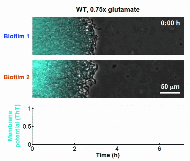 Global oscillations in membrane potential (ThT) in growing Bacillus subtilis biofilms.