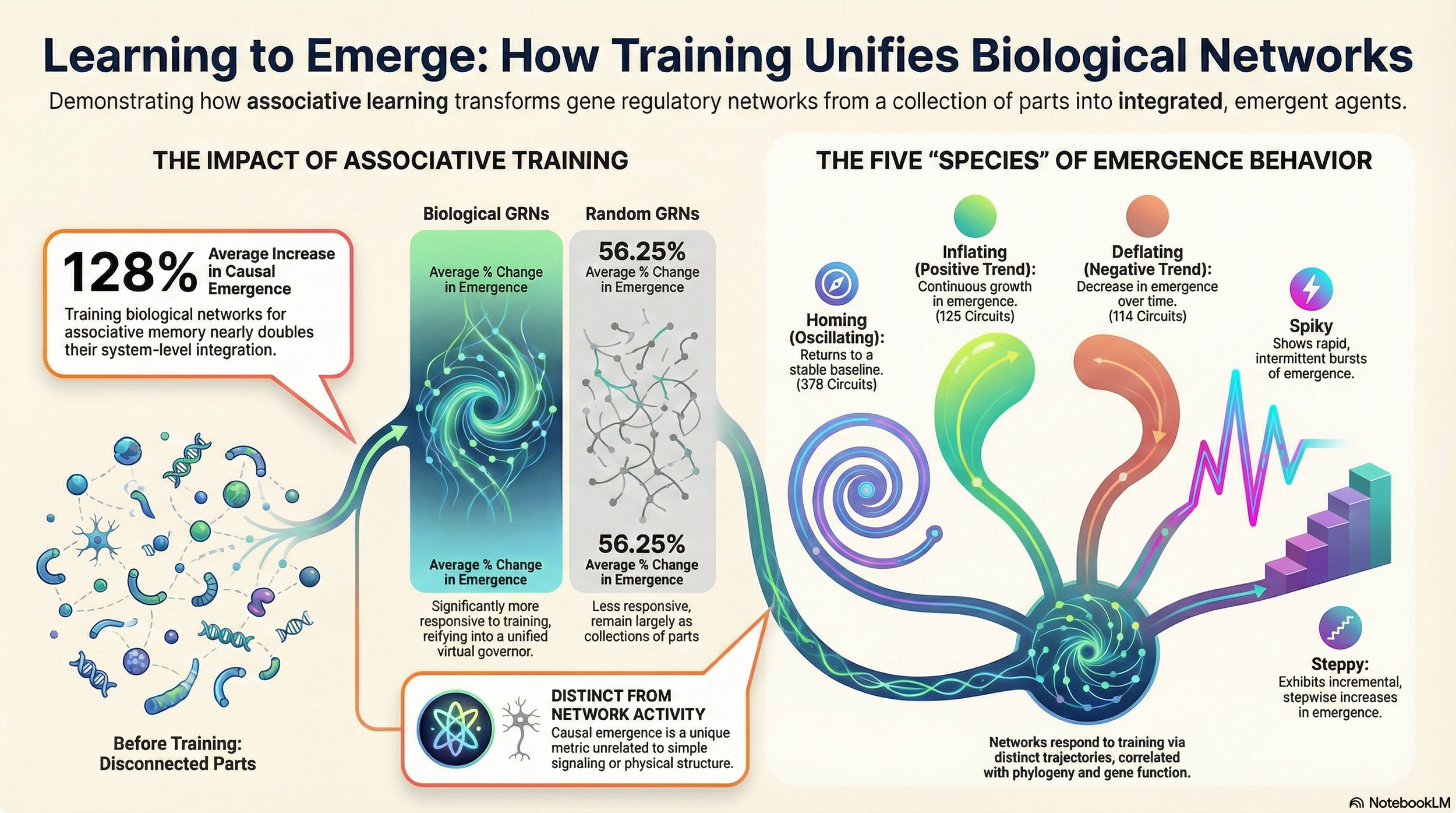 In this work, Levin’s team modeled 29 biological gene regulatory networks (GRNs) and applied a Pavlovian-style associative conditioning protocol—essentially “training” the networks to respond to paired stimuli. The striking result is that the successfully trained networks didn’t just change outputs in a trivial way; they exhibited increased integrative causal emergence (reported as higher Φ / phi). In plain language, the networks became more collectively unified in their causal structure—closer to something like a measurable “selfhood” or coherent agency, rather than a set of disconnected parts.